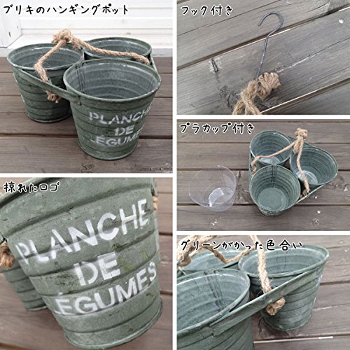 アンティーク風のブリキポット。 使い込むうちに味が出てくるブリキ素材に、ホワイトの掠れたロゴがとってもキュート。 PLANCHE=菜園のこと。植物を育てながら飾るのにピッタリの商品です。 黒板が付いているのでチョークで名前を書いておくことができます。 お気に入りの場所に植物を育てながらアンティーク風のブリキのポットが3つ連なったハンギングポット。 使い込むうちに味が出てくるブリキ素材に、ホワイトの掠れたロゴがとってもキュート。 麻ひもにフックが付いて吊るすタイプのポット。ブリキと麻ひもの組み合わせが可愛いです。 PLANCHE=菜園のこと。植物を育てながら飾るのにピッタリの商品です。 ポットが3つ付いているのでたくさんの植物を飾ることができます。 ハーブやお花を並べて飾ると可愛いです。 お気に入りの場所に植物を育てながら飾ってください。 スタイリッシュなイングリッシュガーデン、ナチュラルなカントリーガーデンには お洒落な小物が似合います。ハイセンスなガーデン作りに役立ちます。 室内のインテリアとして、小物入れとして使用しても素敵です。 他にもいろいろな形とサイズの商品があるので一緒に飾るといい雰囲気です。