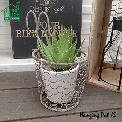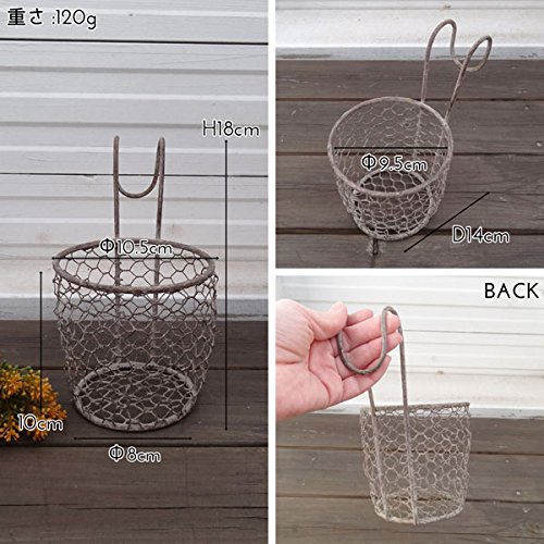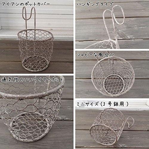 アンティーク感たっぷりのポットカバーです。 グリーンやお花が映える古びた風合ですのでどんな植物にも相性抜群です。 メッシュなので通気性もよく水や埃が溜まりにくいです。 小さいサイズですので幾つか並べてハンギングしてもお洒落です。 Lサイズもございます。 3号サイズですので買ったお花をそのまま入れてすぐ楽しむことができます。