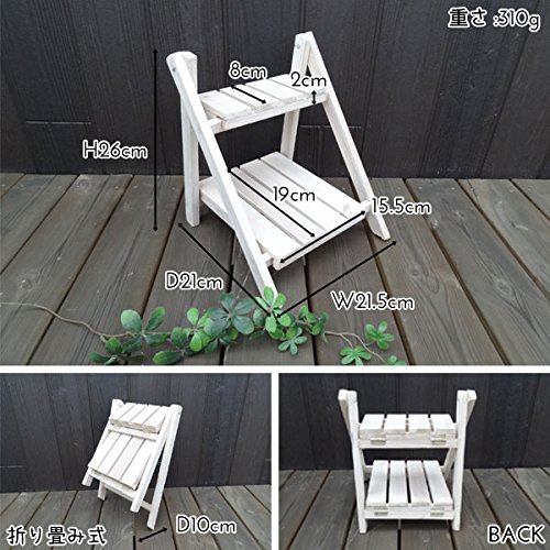 二段の可愛い木製のフラワースタンド。 わざと塗装に剥げや掠れをつけてアンティークな仕上がりになっています。 爽やかなホワイトカラーがインテリアのアクセントに。 棚のサイズが上段にいくにつれて小さくなっているタイプです。 木の温もりを感じる素朴な雰囲気が、グリーンやお花を引き立ててくれます。 小物をディスプレイしても素敵です。 ベランダやお部屋などでちょこっとグリーンを楽しみたいときにぴったりなアイテムです。 折り畳み可能。