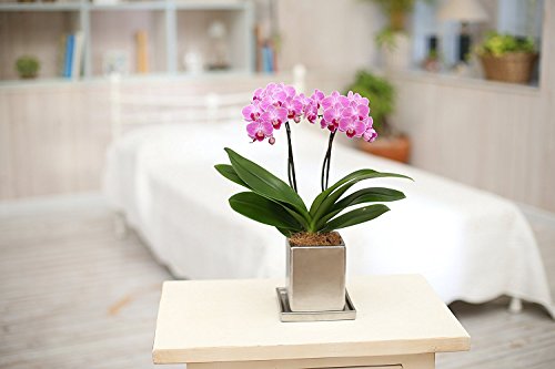 - ピンク系ミディー胡蝶蘭【チュンリー】の鉢植え<シルバー鉢(4号)・2本立ち>をお届けいたします。