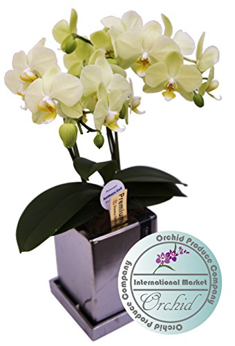 - イエロー系ミディー胡蝶蘭【アンスラカーリー】の鉢植え<シルバー4.5号鉢・2本立ち>をお届けいたします。