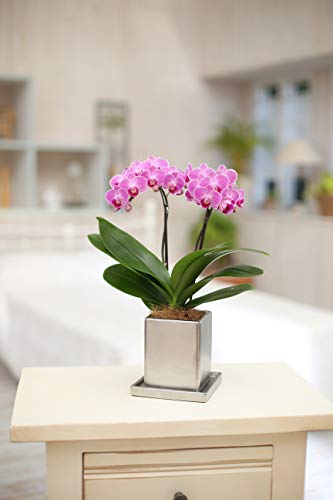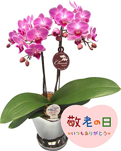 - ピンク系ミディー胡蝶蘭【チュンリー】の鉢植え<シルバー鉢(4.5号)・2本立ち>に、敬老の日のピックをお付けしてお届けいたします。