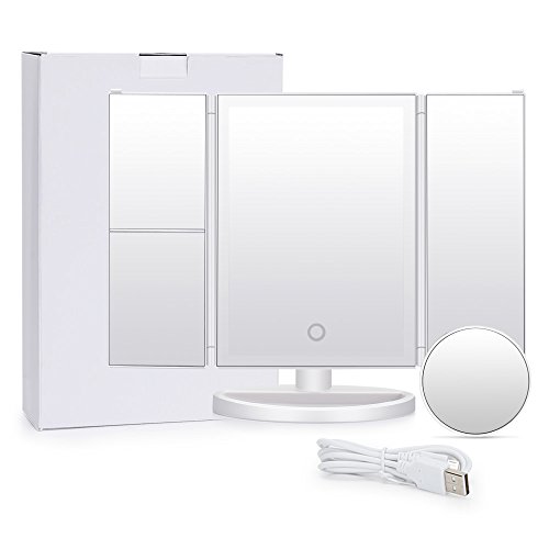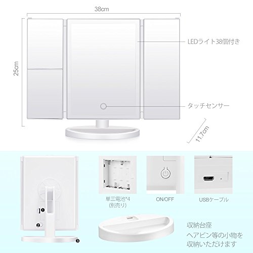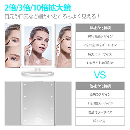 卓上ミラー 化粧鏡 折りたたみ式三面鏡 2倍&3倍&10倍拡大鏡付き 明るさ・角度180度自由調整 LEDライト38個付き USBケーブル/単三電池給電 大きい鏡(38*25*14.5cm)女優ミラー 自用にもプレゼントにも最適です