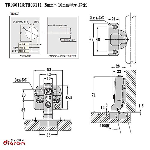 TR03111 ダンパー内蔵/スライド丁番/ワンタッチ(半かぶせ)10個セット