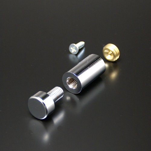 ●商品名:化粧ビスセット フラットタイプ ●品番:EPA-A20F-25C ●材質:真鍮製 化粧ボルト 径(A) : 20mm 厚(B) : 10mm ボルト長 : L20mm (M6 x P1.0) パイプ 径(A) : 20mm 長(L) : 25mm ●表面:クロームメッキ ●付属品:座金 : 1個 透明パッキン(t1.0) : 2枚 タッピングビス 4x25mm : 1本 (※スチール製) ●備考:こちらの商品は壁面などへの設置後でも、化粧ボルトの取り外しが可能ですので、サインボードの交換が簡単に行えます
