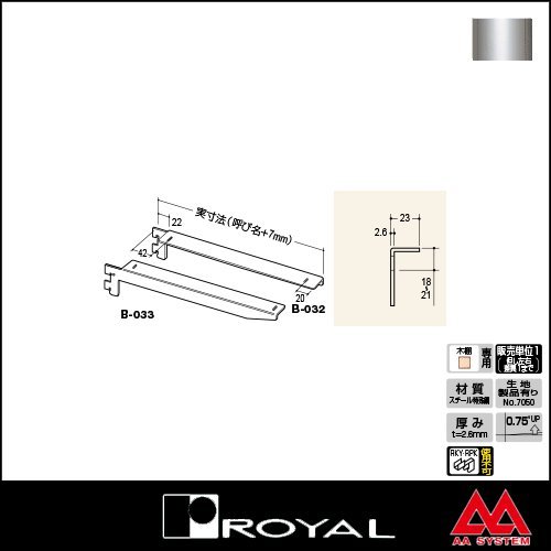 ●商品名:ロイヤル フォールドブラケット B-033 100 クローム ●品番:ROYAL-B-033-100C ●サイズ:呼び名 100 (※実寸法:呼び名+7mm) 対応棚 木棚用 厚み t=2.6mm 角度 0.75°UP ●材質:スチール特殊鋼 ●表面:クロームメッキ ●付属品:この商品に付属品はございません ・ブラケットロッキーRKYとブラケットキーパーRPKのご使用は出来ません。 ・こちらの商品はKD加工(※別売 木棚板簡易固定用ダボかしめ加工)対応可能です。(納期が+1日必要になります) ・販売単位は1本(片側)ずつですが、左右の差異は1本までですのでご注意ください。