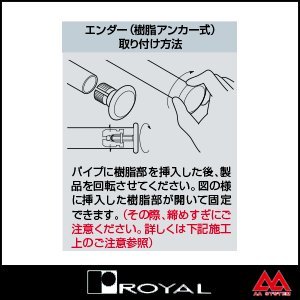 ●商品名:ロイヤル Hバーエンダースチール HES 25 クローム ●品番:ROYAL-HES-25C ●サイズ:38mmφ x 厚み3.0mm ネジ M8 x P1.25 対応パイプ Hバースチール25φ(HB-25)用 ●材質:スチール製 (※嵌合部分はナイロン樹脂) ●表面:クロームメッキ ●付属品:この商品に付属品はございません ・パイプに樹脂部を挿入した後、製品を回転させてください。樹脂部が開いて固定できます。 ・樹脂アンカー製品はある程度手にトルクを感じる程度のの締め込みで十分固定できます。強い力で回し続けると破損の恐れがありますのでご注意ください。
