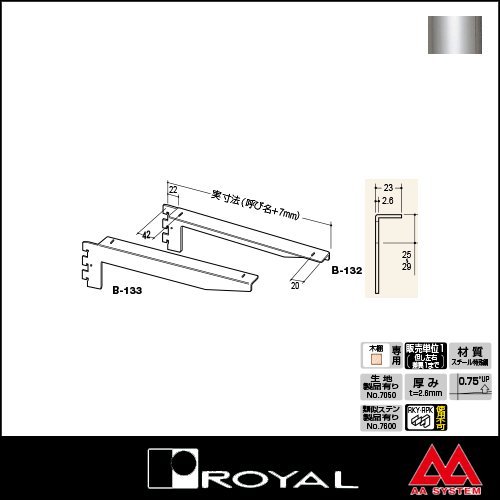 ●商品名:ロイヤル フォールドブラケット B-133 250 クローム ●品番:ROYAL-B-133-250C ●サイズ:呼び名 250 (※実寸法:呼び名+7mm) 対応棚 木棚用 厚み t=2.6mm 角度 0.75°UP ●材質:スチール特殊鋼 ●表面:クロームメッキ ●付属品:この商品に付属品はございません ・ブラケットロッキーRKYとブラケットキーパーRPKのご使用は出来ません。 ・こちらの商品はKD加工(※別売 木棚板簡易固定用ダボかしめ加工)対応可能です。 ・販売単位は1本(片側)ずつですが、左右の差異は1本までですのでご注意ください。