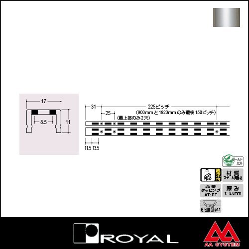 ●商品名:ロイヤル チャンネルサポート(ダブル) AWF-5 1820mm クローム ●品番:ROYAL-AWF-5-1820C ●サイズ:17 x 11mm ●長さ:1820mm 厚み 2.0mm ビス穴数 10 (3.3φ穴-6.5φ皿 225ピッチ) 必要タッピング Aタッピング(AT-P) Bタッピング(BT-P) ※別売 ●材質:スチール異型材 色 クローム ●付属品:この商品に付属品はございません ・切断対応は可能です。(※別途切断費用が必要です) ・パイプロッカーPLのご使用は出来ません。
