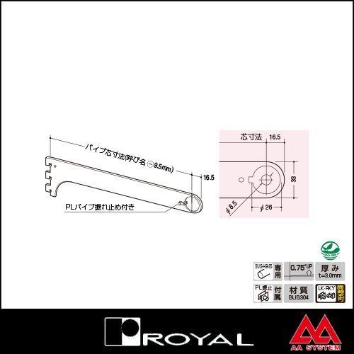 ●商品名:ロイヤル ステンレスハンガーブラケット(外々用) SUS-A-79 250 ステンレスヘアライン ●品番:ROYAL-SUS-A-79-250 ●サイズ:呼び名 250 (※パイプ芯寸法:呼び名-9.5mm) 対応パイプ Hバーステンレス25φ(SUS-HB-25)用 厚み t=3.0mm 角度 0.75°UP 加工対応(別売) PLパイプ振れ止め(付属品)のかしめ加工対応可能 (※追加加工となりますので、PL用加工商品を一緒にご購入ください。) ●材質:ステンレス SUS304 ●表面:ステンレスヘアライン ●付属品:この商品にはパイプロッカー(PL)が付属されております ・パイプロッカー(PL)用の専用レンチは別売りとなります(※パイプガードフィルム(PGT-T)を使用される時など、回転してフィルムの機能を損なっていまわないために、しっかり締め付けておくことをお勧めします。) ・LK(※別売)とRKY(※別売)の同時使用は出来ません。