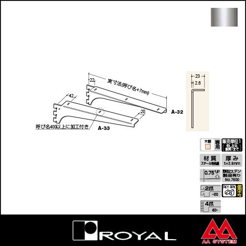 ●商品名:ロイヤル ウッドブラケット A-32 300 クローム ●品番:ROYAL-A-32-300C ●サイズ:呼び名 300 (※実寸法:呼び名+7mm) 対応棚 木棚用 厚み t=2.6mm 角度 0.75°UP ●材質:スチール特殊鋼 ●表面:クロームメッキ ●付属品:この商品に付属品はございません ・ブラケットロッキーRKYとブラケットキーパーRPKのご使用は出来ません。 ・KD加工(※別売 木棚板簡易固定用ダボかしめ加工)をご希望の場合はDA-32をお求めください。(※クロームのみ) ・販売単位は1本(片側)ずつですが、左右の差異は1本までですのでご注意ください。