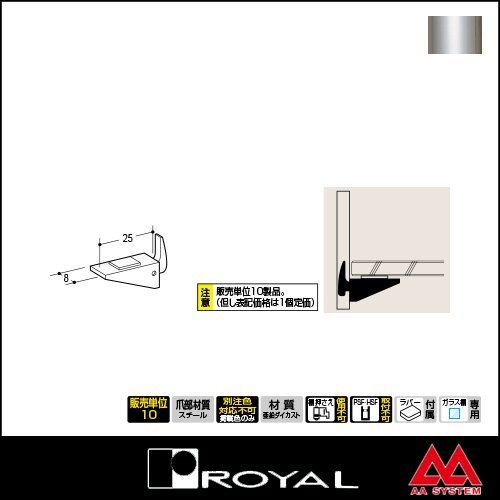 ●商品名:ロイヤル ナローダボ25 N-25 クローム ●品番:ROYAL-N-25C ●サイズ:ダボ幅:8mm ダボ●長さ:25mm 対応棚 ガラス棚専用 ●材質:亜鉛ダイカスト 色 クロームメッキ ●付属品:この商品にはラバーが付属されております ※10個セット販売の商品です ・こちらの商品はチャンネルペッカーサポート(PSF)、H型サポート(HSF)には取付けが出来ません。 ・棚押さえ商品との併用は出来ません。