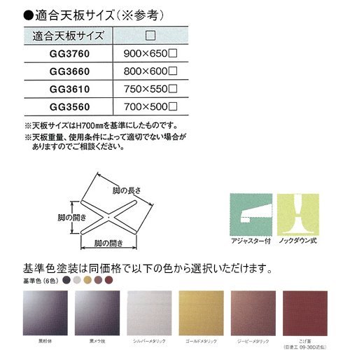 ●商品名:テーブル脚 GG3660 ●品番:YMT-GG3660-38P ●ベースサイズ:脚の長さ(対角) : 660mm 脚の開き : 535mm x 355mm ※アジャスター付 ●ベース高さ:75mm ●パイプ:38.1φ ●高さ:700mmまでのご希望サイズをご指定ください ●受座:280φ(NO.101) ラッパ型 木ネジ8ヶ穴(十字穴) ●適合天板:角天板 800mm x 600mm角まで ・天板サイズは高さ700mmを基準にしたものです。 ・天板重量やご使用条件によって適切でない場合があります。 ●パイプ材質仕上:スチール製 基準色塗装 ※色をお選びください ●ベース材質仕上:スチール製 基準色塗装 ※色をお選びください ●付属品:この商品に付属品はございません(※取付ビスは付属しておりません) ●組立方式:ノックダウン式 ※商品到着後に簡単な組立作業がございます ●備考:■ノックダウン式 開梱後ベースにパイプを差し込んで組み立ててご使用ください。