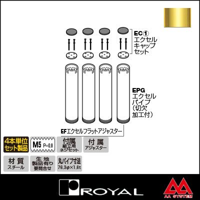 商品名 ロイヤル テーブル脚 エクセルフレームフラットガラスタイプ4本セット76φ EF1-76 ~670mm APゴールド 品番 ROYAL-EF1-76-670G パイプ径 実寸 76.3mmφ パイプ厚 1.6mm 総高さ 471mm?670mm ※キャップセットとアジャスターを含めた高さです ご指定のサイズに仕上げます(切断費用は価格に含まれております) 材質 スチール 表面 APゴールド 付属品 ・組立用ネジセット ・EF エクセルフラットアジャスター(黒樹脂) 納期 約1週間ほど納期が必要です 返品・交換 こちらの商品は返品・交換が不可となります 備考 ・ポール脚は4本セットでの販売となりますが、1台組み立てるためにはエクセルバー(EB-24)が4本必要になりますので、ポール脚とは別にお買い求めください。