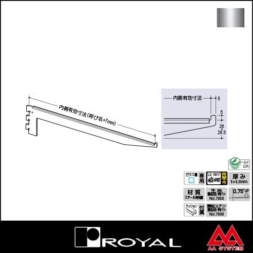 ●商品名:ロイヤル スリムブラケット B-111 350 クローム ●品番:ROYAL-B-111-350C ●サイズ:呼び名 350 (※内側有効寸法:呼び名+7mm) 対応棚 ガラス棚用 厚み t=3.0mm 角度 0.75°UP ●材質:スチール特殊鋼 ●表面:クロームメッキ ●付属品:この商品にはクッションが付属されております ・LK(※別売)とRKY(※別売)の同時使用は出来ません。