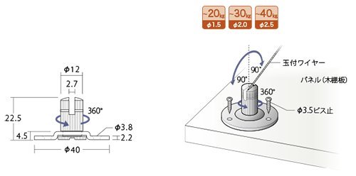 ●商品名:ワイヤーシステムパーツ 玉付ワイヤー用 吊り金具 ●品番:RWP-352A ●材質:真鍮・スチール製 ●表面仕上:パールニッケルメッキ 対応ワイヤー RWW-C 玉付ワイヤー 1.5~2.5mmに対応します 許容荷重 1.5mmワイヤー時 20kg以内 2.0mmワイヤー時 30kg以内 2.5mmワイヤー時 40kg以内 ●付属品:この商品に付属品はございません