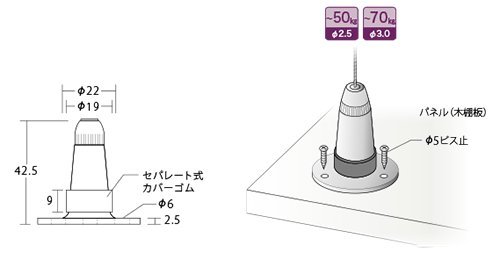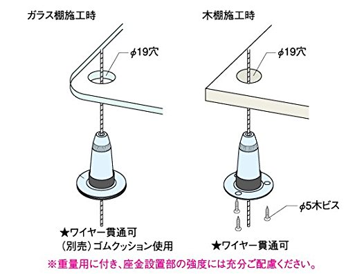 ●商品名:ワイヤーロック ロック吊り金具 ●品番:RWL-102G ●材質:ステンレス製 ●表面仕上:パールニッケルメッキ 対応ワイヤー 2.5~3.0mmワイヤー対応 許容荷重 2.5mmワイヤー 50kg以内 3.0mmワイヤー 70kg以内 ●付属品:カバーゴム ●備考:・重量用につき、座金の取付強度には十分に配慮してください ・荷重をかける前に、ワイヤーをロックに十分挿入している事を確認してください ・荷重の不均衡や揺れ等で思わぬ負荷がかかる事があります、許容荷重には余裕をもってください