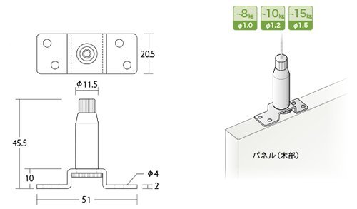 ●商品名:ワイヤーロック ロック吊り金具 ●品番:RWL-343A ●材質:真鍮・スチール製 ●表面仕上:パールニッケルメッキ 対応ワイヤー 1.0~2.5mmワイヤー対応 (※ワイヤー貫通可) 許容荷重 1.0mmワイヤー 8kg以内 1.2mmワイヤー 10kg以内 1.5mmワイヤー 15kg以内 ●付属品:ワイヤーロックと吊り金具が一体型になった商品です ・荷重をかける前に、ワイヤーをロックに十分挿入している事を確認してください ・荷重の不均衡や揺れ等で思わぬ負荷がかかる事があります、許容荷重には余裕をもってください