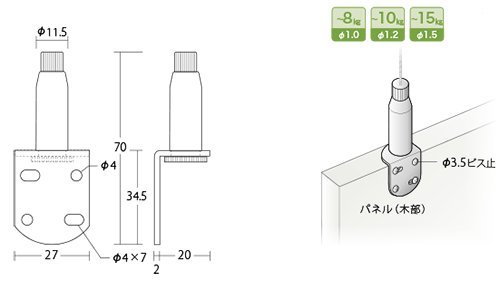 ●商品名:ワイヤーロック ロック吊り金具 ●品番:RWL-344A ●材質:真鍮・スチール製 ●表面仕上:パールニッケルメッキ 対応ワイヤー 1.0~2.5mmワイヤー対応 許容荷重 1.0mmワイヤー 8kg以内 1.2mmワイヤー 10kg以内 1.5mmワイヤー 15kg以内 ●付属品:ワイヤーロックと吊り金具が一体型になった商品です ・荷重をかける前に、ワイヤーをロックに十分挿入している事を確認してください ・荷重の不均衡や揺れ等で思わぬ負荷がかかる事があります、許容荷重には余裕をもってください
