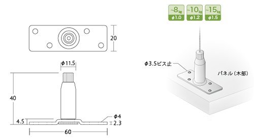 ●商品名:ワイヤーロック ロック吊り金具 ●品番:RWL-345A ●材質:真鍮・スチール製 ●表面仕上:パールニッケルメッキ 対応ワイヤー 1.0~2.5mmワイヤー対応 許容荷重 1.0mmワイヤー 8kg以内 1.2mmワイヤー 10kg以内 1.5mmワイヤー 15kg以内 ●付属品:ワイヤーロックと吊り金具が一体型になった商品です ・荷重をかける前に、ワイヤーをロックに十分挿入している事を確認してください ・荷重の不均衡や揺れ等で思わぬ負荷がかかる事があります、許容荷重には余裕をもってください