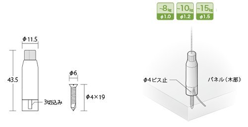 ●商品名:ワイヤーロック ロック吊り金具(ワイヤー逃し) ●品番:RWL-348A ●材質:真鍮・スチール製 ●表面仕上:パールニッケルメッキ 対応ワイヤー 1.0~2.5mmワイヤー対応 (※ワイヤー貫通可) 許容荷重 1.0mmワイヤー 8kg以内 1.2mmワイヤー 10kg以内 1.5mmワイヤー 15kg以内 ●付属品:取付ビス 4x19 ・荷重をかける前に、ワイヤーをロックに十分挿入している事を確認してください ・荷重の不均衡や揺れ等で思わぬ負荷がかかる事があります、許容荷重には余裕をもってください