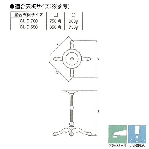 ●商品名:テーブル脚 アルミ鋳物 CL-C-700 ●品番:HYS-CLC700-625-44O ●ベースサイズ:A寸法:710mm B寸法:525mm C寸法:525mm ※アジャスター付 ●高さ:625mm ※高さの変更は出来ません ●受座:290φ ●適合天板:角天板 750mm角まで / 丸天板 900mmφまで ・天板重量やご使用条件によって適切でない場合があります。 ●パイプ材質仕上:アルミ製 黒半艶塗装(屋外用) ●ベース材質仕上:アルミ鋳物ベース 黒半艶塗装(屋外用) ●付属品:この商品に付属品はございません(※取付ビスは付属しておりません) ●組立方式:こちらの商品は組み立てて発送いたします。 備考