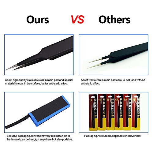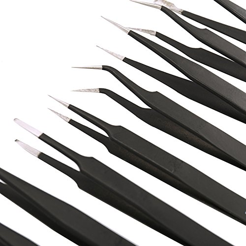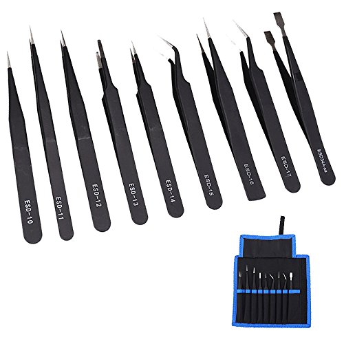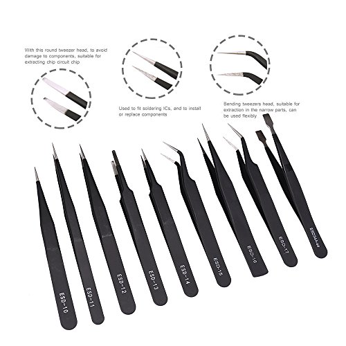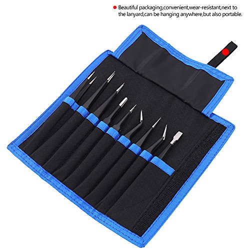 elfishjp 精密ESDピンセット 9本セット 防磁 静電防止 ステンレス製 ツイーザー メンテナンス用 精密機器 電子工作 模型製作 極細 黒 収納袋付