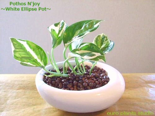 商品詳細: 学 名:Epipremnum aureum N'Joy' 英 名:Variegated Pothos 分 類:常緑つる性植物 科属名:サトイモ科/スキンダプサス属 原産地:園芸品種 花言葉:華やかな明るさ ◆どんな植物?◆ ポトス“エンジョイ”はインドの生産農場でポトスの枝変わりとして発見され、育種栽培の過程で植物遺伝が確認されました。その後、園芸先進国『オランダ』へ渡り本格的な生産が始まりました。 2007年にはヨーロッパ中が注目し、世界一のアールスメール花き市場主催のイベントで、栄えある【2007 FLORA HOLLAND AWARD 】を受賞!現在に於いてもヨーロッパ市場ではとても高く評価されている品種です。 今までのポトスよりも小葉で生育し、とてもスマートな姿、たまらないくらいの班入りの美しさ…。それでいて根はとても強く、寒さにも強い傾向で、その『丈夫さ』にも非常に高い評価を得ています。 環境がある程度整っていればあなたのお部屋でもスクスクと美しく成長していくことでしょう。現在、園芸愛好家をはじめ、インテリア観葉植物として注目度急上昇中のポトスです。 なんともユニークな楕円形…モダンアート満点のホワイトイリプスポット…。他にない一品をお探しの方には大変オススメです^^ 洗練された独特のフォルムが、良質の『ポトス エンジョイ』と抜群にマッチする自信の一品です♪