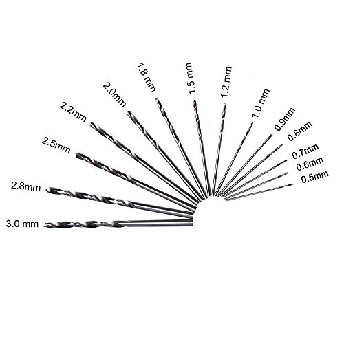 - ツイストドリルビットビットセット、スピンドル直径0.5-3mm:0.5mm / 0.6mm / 0.7mm / 0.8mm / 0.9mm / 1.0mm / 1.2mm / 1.5mm / 1.8mm / 2.0mm / 2.2mm / 2.5mm / 2.8 mm / 3.0mm(各1個分)。