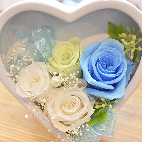 [florence du]プリザーブドフラワー 白バラ、ブルー、グリーンバラ ハートスタンドアレンジメント 専用クリアケース付