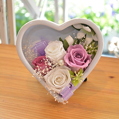 [florence du]プリザーブドフラワー 紫・白バラ お供え用ハートスタンドアレンジメント 専用クリアケース付 仏花 仏壇 彼岸