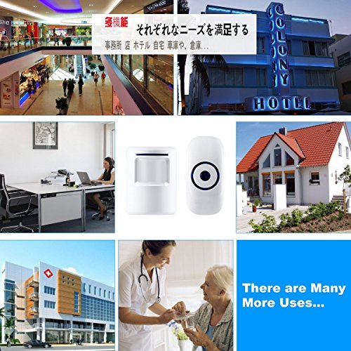 - 「来客通知、防犯に便利」玄関チャイム、来客チャイム、会社や商店の出入り口の自動お知らせチャイムとして人の動きを【送信機】が感知、離れた場所の【受信機】が音でお知らせします。受信機電波受信距離は屋外遮蔽物の無い状態で200m屋内で見通しの良い場所で最大90m。ご自宅や店舗、事務所に倉庫などの防犯対策に持って来いのアイテムです