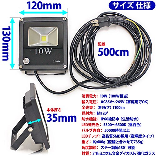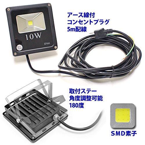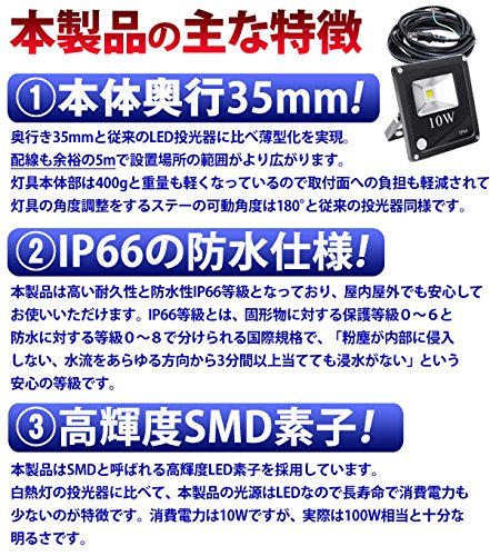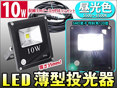 LED 投光器 10w 薄型タイプ 昼光色 省エネ 投光器 屋外 看板 照明 ワークライト 照射角120度!本体色ブラック SMD素子 5m配線 IP66規格 【10W×1台売り】