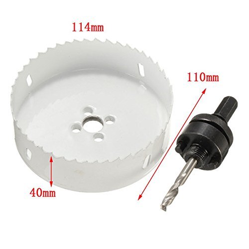 Description: Material Tungsten Steel Diameter of Holesaw 114mm Height of Holesaw 40mm Length of Drill 110mm Quantity 1Set (1 Holesaw+1 Arbor) Bi-metal construction. Hardened HSS teeth. Flexible high carbon steel backing for fast clean cut. Arbor fits holesaws from 32 to 152mm. 11mm Hex Shank. Compatible with 1/4" HSS Pilot Drill. Package Included: 1 x Holesaw 1 x Drill