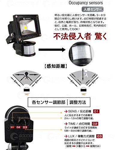 - 発光色:昼白色 防水クラス:IP66 センサー有効距離:1m~12mの間で調節可能