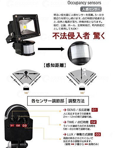 - 消費電力 :10W (100W相当) 照明方法 :人感センサー+光センサー+スイッチ 発光色:昼白色 防水クラス:IP66