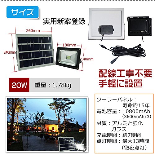 - セット内容:ライト本体 、ソーラーパネル、5m接続コードTYH-5M、18650型充電池(品番:LDC-361A)*3本、日本語取扱説明書 注意:暗くなると自動点灯します。 ソーラーパネルが光を感知すると、点灯出来ません。 本製品は、長時間点灯タイプの為、バッテリー容量が一定以下になると明るさが低減する仕様となります。
