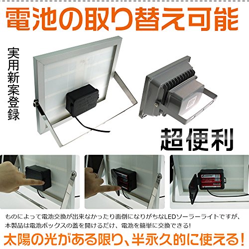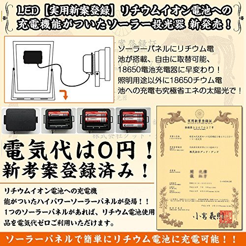 4【太陽光から18650バッテリー充電が可能!】 ソーラーパネルに18650充電池が搭載されているため、投光器と分離して、ポータブル充電器として使用することが可能! 一般的なLEDソーラーライトは、バッテリーや電池が内蔵されており交換が困難な物が多い中、本製品は電池ボックスの蓋を開けるだけで、電池交換が簡単!
