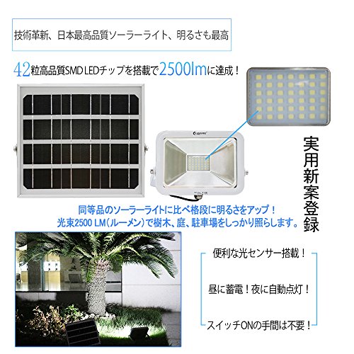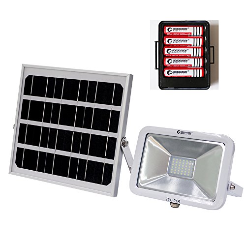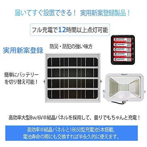 - ソーラーパネル8w 、6v 変換効率:17% 注意:暗くなると自動点灯します。 ソーラーパネルが光を感知すると、点灯出来ません。 本製品は、長時間点灯タイプの為、バッテリー容量が一定以下になると明るさが低減する仕様となります。 セット内容:LEDライト、ソーラーパネル、18650型充電池LDC-361A*5本、 2.5mコードTYH-28M 、取扱説明書、保証書