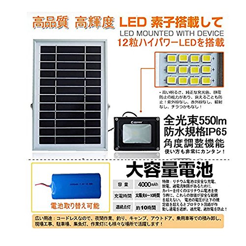 - 充電池:電池(Li-ion)4000mAh(2000mAh*2本) (寿命約3年) ソーラーパネル:10v/5w(寿命約15年) 点灯時間:最大10時間