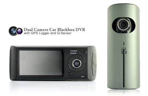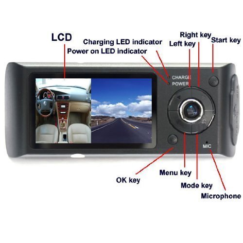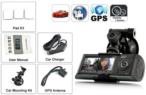 Hot Spots: Car Blackbox DVR Dual Cameras - 5MP Front and 0.3MP Back GPS Logger and G-Sensor 2.7 Inch LCD Screen Built-in Battery Protect yourself from fraudulent lawsuits on the road Specifications Screen: 2.7 inch TFT LCD screen Lens: f: 2mm; F, 2.0 (IR lens) Camera: Front: 5MP (140 degree wide angle) Back: 0.3MP (120 wide angle) Minimum LUX: 0.1 Color sensor: 1/4" color CMOS Video resolution: 1280*480 @ 30 FPS Video format: AVI Cycled recording: Yes Image Resolution: 2560*1920 Memory: Micro SD card up to 32GB (not included) Microphone / speaker: Built-in Time stamp: Yes Video system: PAL Battery: Built-in lithium polymer battery or car charger Battery life: 3 hours Dimensions: 125mm x 32mm x 50mm (L x W x H, without bracket) Color:Blach&Gray X3000 Package Contents Car Blackbox DVR Cigarette Power Adapter GPS Antenna Mounting Kit User Manual Mounting Pad