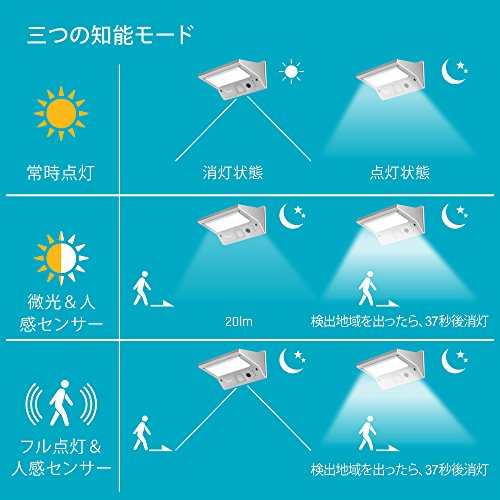明暗センサーが搭載されて、周りの環境の照度を感知でき、照明機能を自動的にON/OFFします。三つのモードがあり、必要により、正面で設置されたボタンで選んでください。センサー範囲は角度120度、従来のセンサーライトより30度ひろがっています。検出距離は3から5メートル。