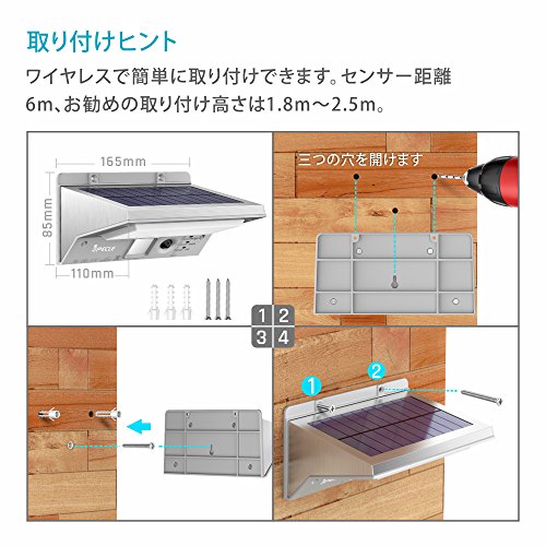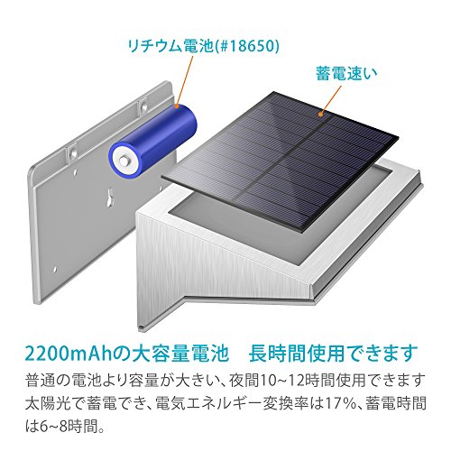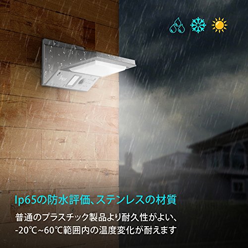 - 【高品質の材質】屋外センサーライト 、ステンレスを採用し、質感がより良くなり、耐久性もより向上します。ソーラーパネルはガラスでコーティングされて、透光性はプラスチック製品より良くなります。マイナス20度から60度までの温度範囲内で温度変化が耐えます。IP65防水仕様で厳しい天候条件でも耐えるように設計されています。動物や風による誤検知を防ぐため、約1秒から2秒までの感知延長デザインをしました。