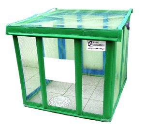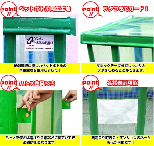 ペットボトルをリサイクルして作られたゴミ置き場の折りたたみカラスよけ商品。軽量化されているので持ち運び、収納は簡単で使いやすい。環境を考慮し、再生ネットを使う事によりエコロジカルな観点から地域住民の方に理解を得やすい 商品です。