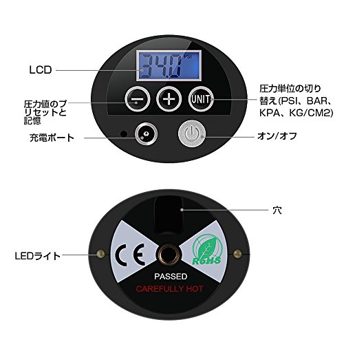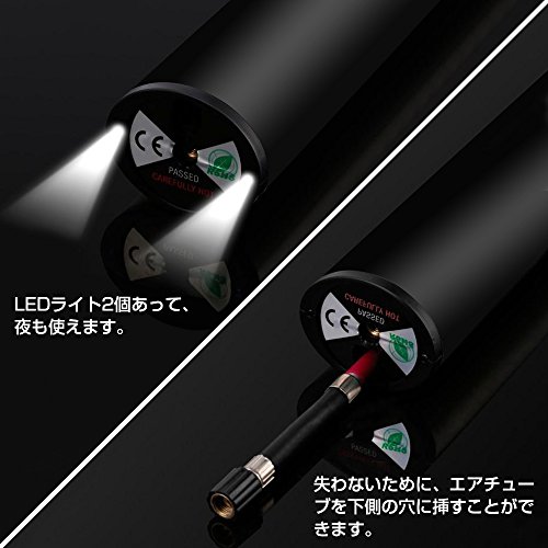 - 【空気圧測定と独特な設計】精度:±1.5psi。デジタル表示、簡単に読み取れます。バックライト液晶付き、ガレージや暗闇でも見やすくなります。また、LEDライト2個あり、夜の使用には助かります。そして、失わないために、エアチューブをインフレータの底部の穴に挿すことができます。
