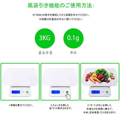 - 【高精度】高精度な測定範囲:0.1gから3000gまで量れます。 高感度センサーで、精度が高いです。お料理などを作る際、食材や調味料の精密な量を確認するために最適!