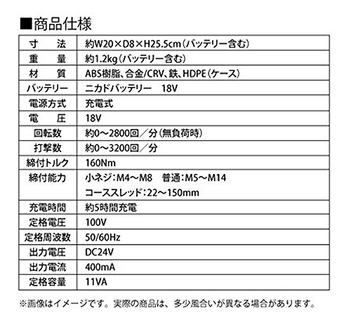 - 電源:充電式 電圧:18V 回転数:約0~2800回/分(無負荷時) 打撃数:約0~3200回/分 締付トルク:150Nm 締付能力:小ネジ:M4~M8 普通:M5~M14