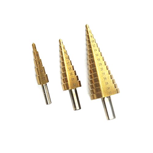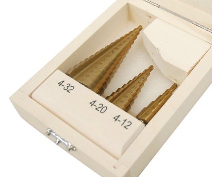 iimono117 ステップドリル スパイラル タケノコドリル 3本セット / 収納 木箱 ケース 付き チタンコーティング 穴あけ バリ取り 面取り 穴拡大 三本 4 - 32 mm シャンク径 6 8 10mm