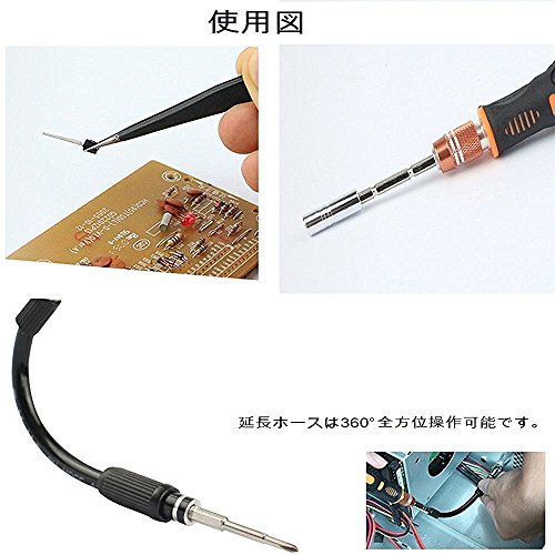 - ビットのほかに、2種類の延長用エクステンション (まっすぐな硬いものと曲がる柔らかいもの)及びピンセットが付いています。