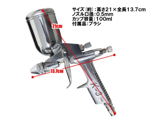 - 【商品詳細】サイズ(約):幅7.6×高さ21×全長13.7㎝、塗料供給方式/重力式、塗料ノズル口径/0.5mm、カップ容量/100ml
